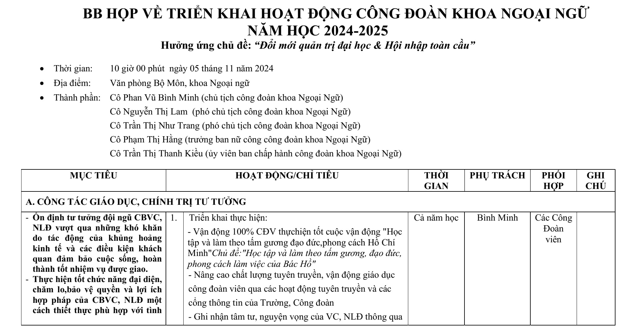 1. Vận động 100% CĐV thực hiện tốt cuộc vận động "Học tập và làm theo tấm gương đạo đức, phong cách Hồ Chí Minh". Chủ đề:"Học tập và làm theo tấm gương, đạo đức, phong cách làm việc của Bác Hồ".