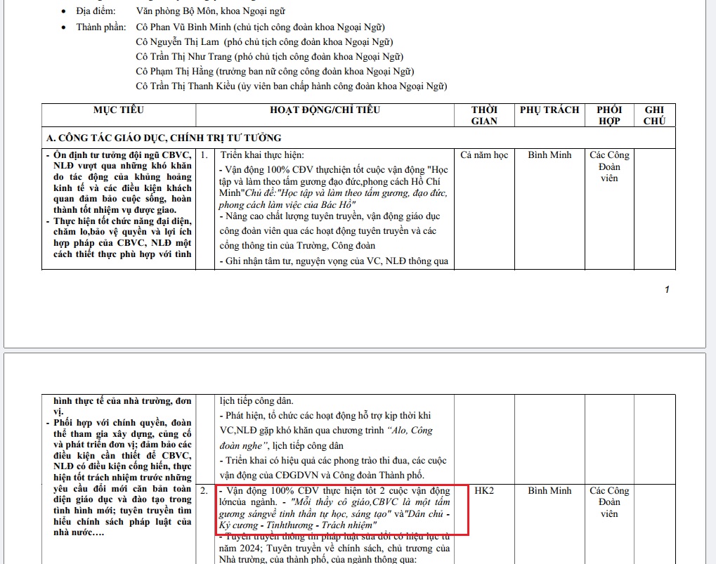 2. Vận động 100% CĐV thực hiện tốt 2 cuộc vận động lớn của ngành. - "Mỗi thầy cô giáo, CBVC là một tấm gương sáng về tinh thần tự học, sáng tạo" và "Dân chủ - Kỷ cương - Tình thương - Trách nhiệm".